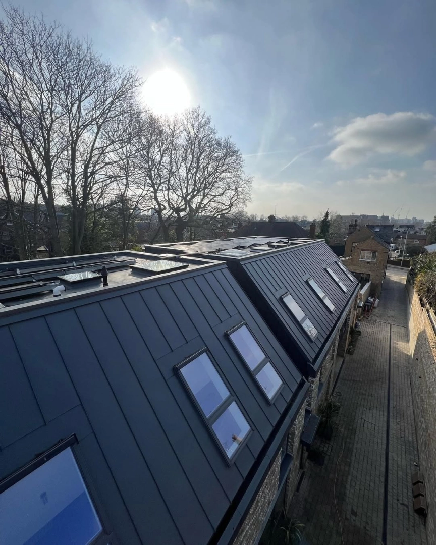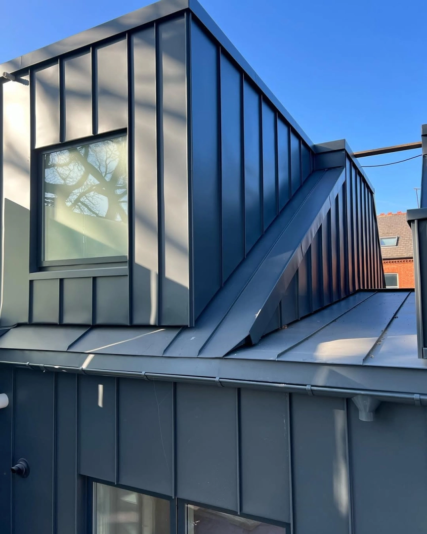 Pleased to share a closer look at this completed rear extension in Kingston, London, featuring a sleek standing seam roofing and cladding system finished in GreenCoat PLX.