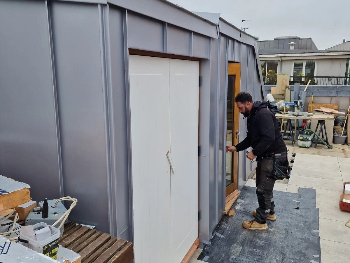 VM Zinc Anthra standing seam roof panels with vented plywood for a sleek and functional finish at Si...